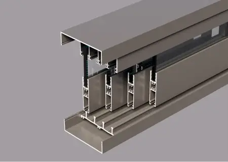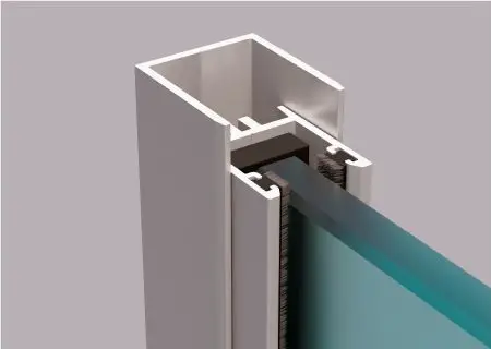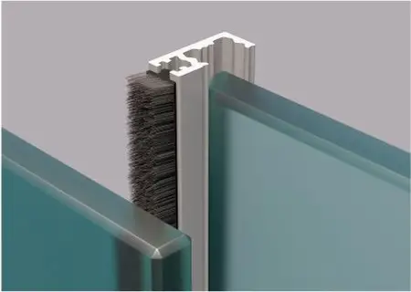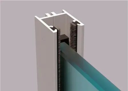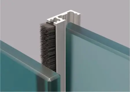Элементы остекления Закаленное стекло толщиной 10 мм;   Стекольный алюминиевый профиль;   Межстекольный уплотнитель из эластичного нейлона;   Щеточный уплотнитель;   Антифрикционные боковые вставки;   Каретки из нержавеющей стали;   Механизм блокировки;   Двустороняя ручка из нержавеющей стали;   Направляющая шина;
