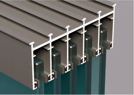 Рекомендуемая высота панели 3 метра, максимальное количество стеклянных панелей 12 шт. Представлен в двух вариантах сдвижных дорожек на 4 и 6 стекол и соответственно 4/8 и 6/12 раздвижных панелей. Дорожки опираются на нижний несущий рельс с помощью специального алюминиевого профиля, движение осуществляется с помощью антифрикционных роликов. Совместима со всей линейкой пергол Decolife.